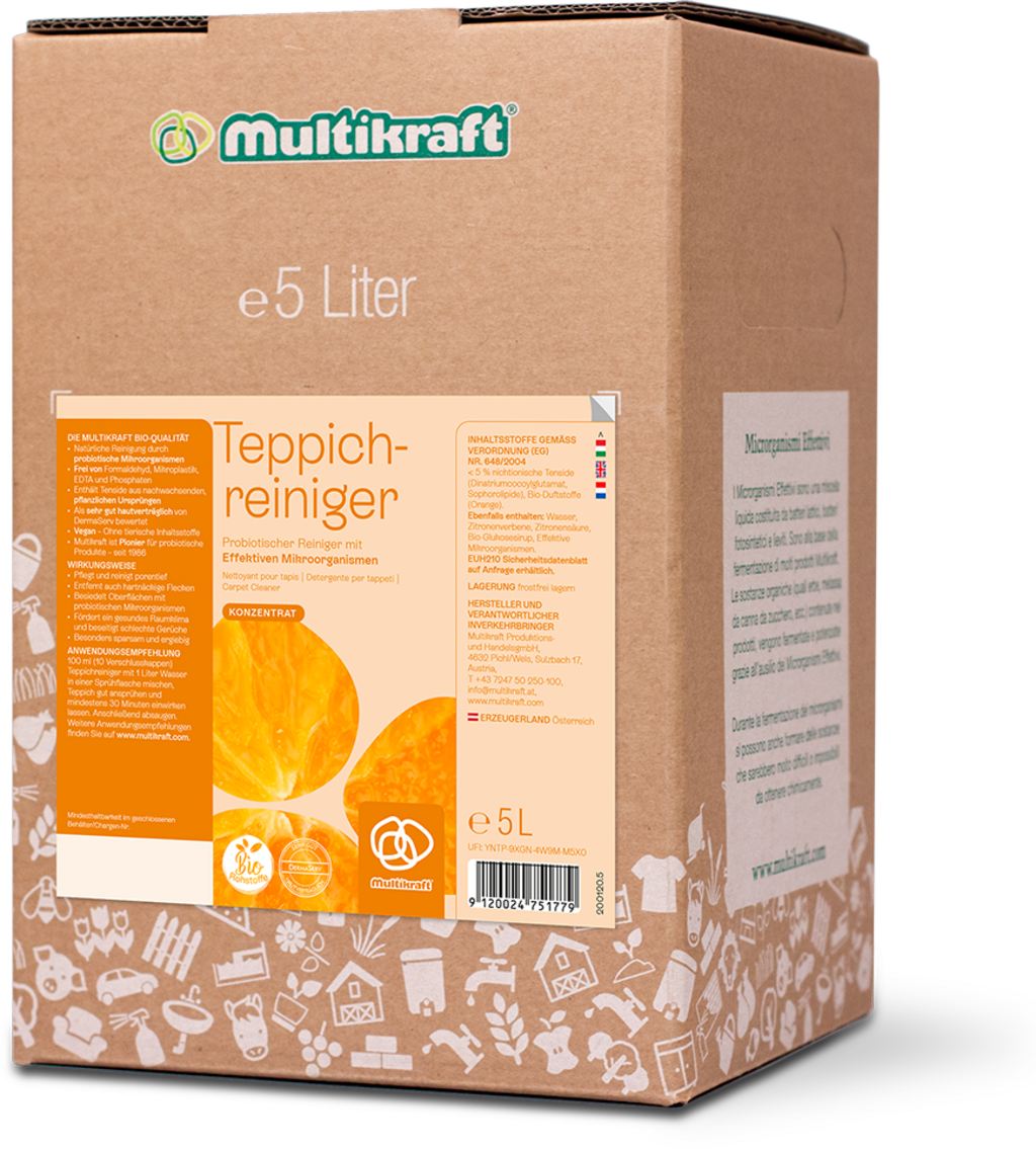 The eMC carpet cleaner ensures that carpets and rugs are in tip-top shape! The contained probiotic microorganisms remove stains and create long-lasting cleanliness, as they stick to the textiles and become active when new soiling occurs. The cleaner effectively neutralises unpleasant odours and gives the textiles a fresh citrus scent.